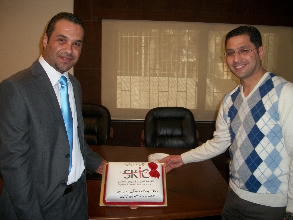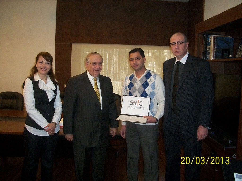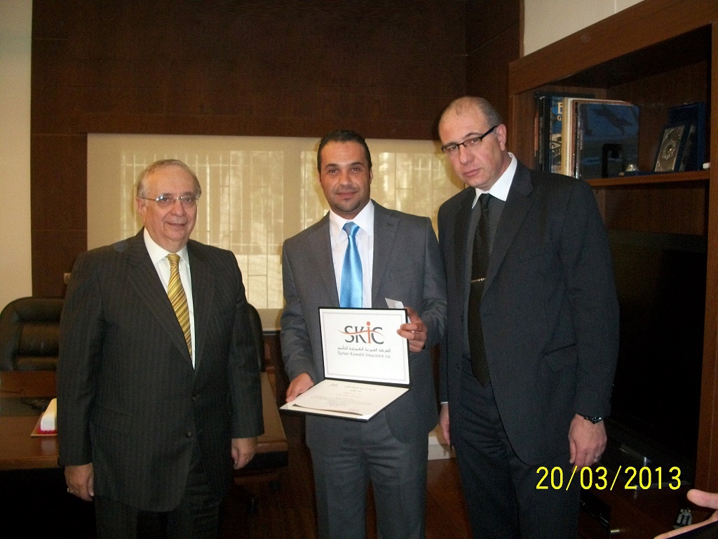 احتفلت الشركة السورية الكويتية للتأمين بتكريم موظفها السيد مالك حمزاوي الذي تم اختياره موظفاً مميزاً لعام 2012 وكذلك موظفها السيد خالد رسلان بوصفه أفضل منتج للشركة لنفس العام حيث تم في الحتفال توزيع شهادات التقدير والهدايا عليهما.